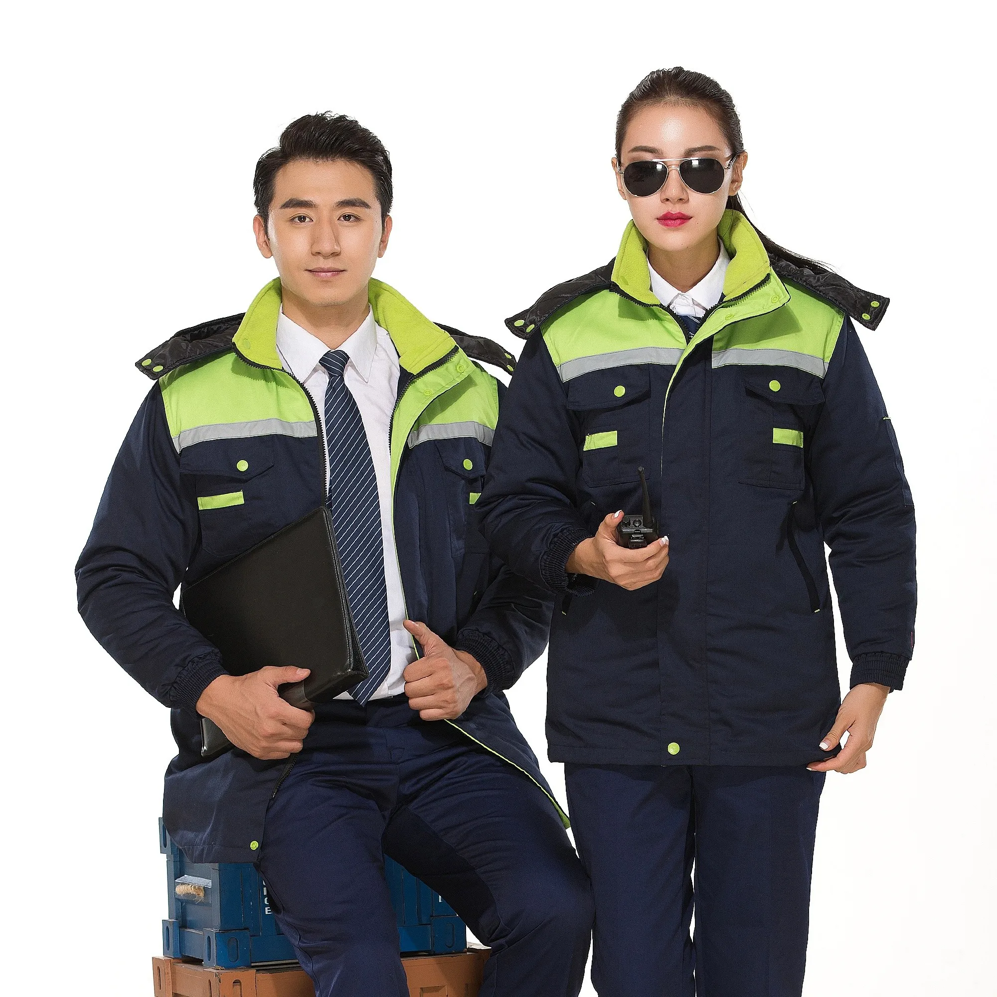 Winter workwear in navy blue and green, supporting custom style design, with the option to print text and logos